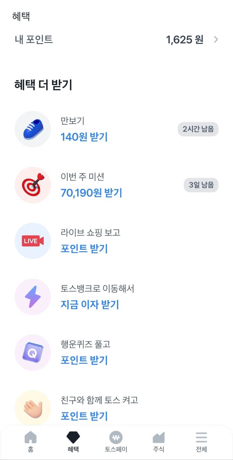 은행 앱이지만 참 혜택이 많습니다. 일단 유동적으로 사용해야 하는 돈을 그냥 통장에 입금해놓아도 매일 2.7% 이자가 쌓이고 그것을 매일 이자 받기 하여 복리 효과를 누릴 수 있습니다. 그 외 걷기 미션을 클리어하면 하루 최대 150원 적립이 가능하고 각종 클릭 미션, 퀴즈 풀기 등으로 현금을 적립할 수 있습니다. 또한 토스 체크 카드 5천원 이상 사용하면 미국 주식을 100원씩 주고 그 외 클릭 이벤트로도 미국 주식을 자주 주는데 그냥 갖고 있다가 오르면 팔고 달러 갖고 있다가 달러 오르면 환전하는데 달러 환전 수수료가 0원입니다.