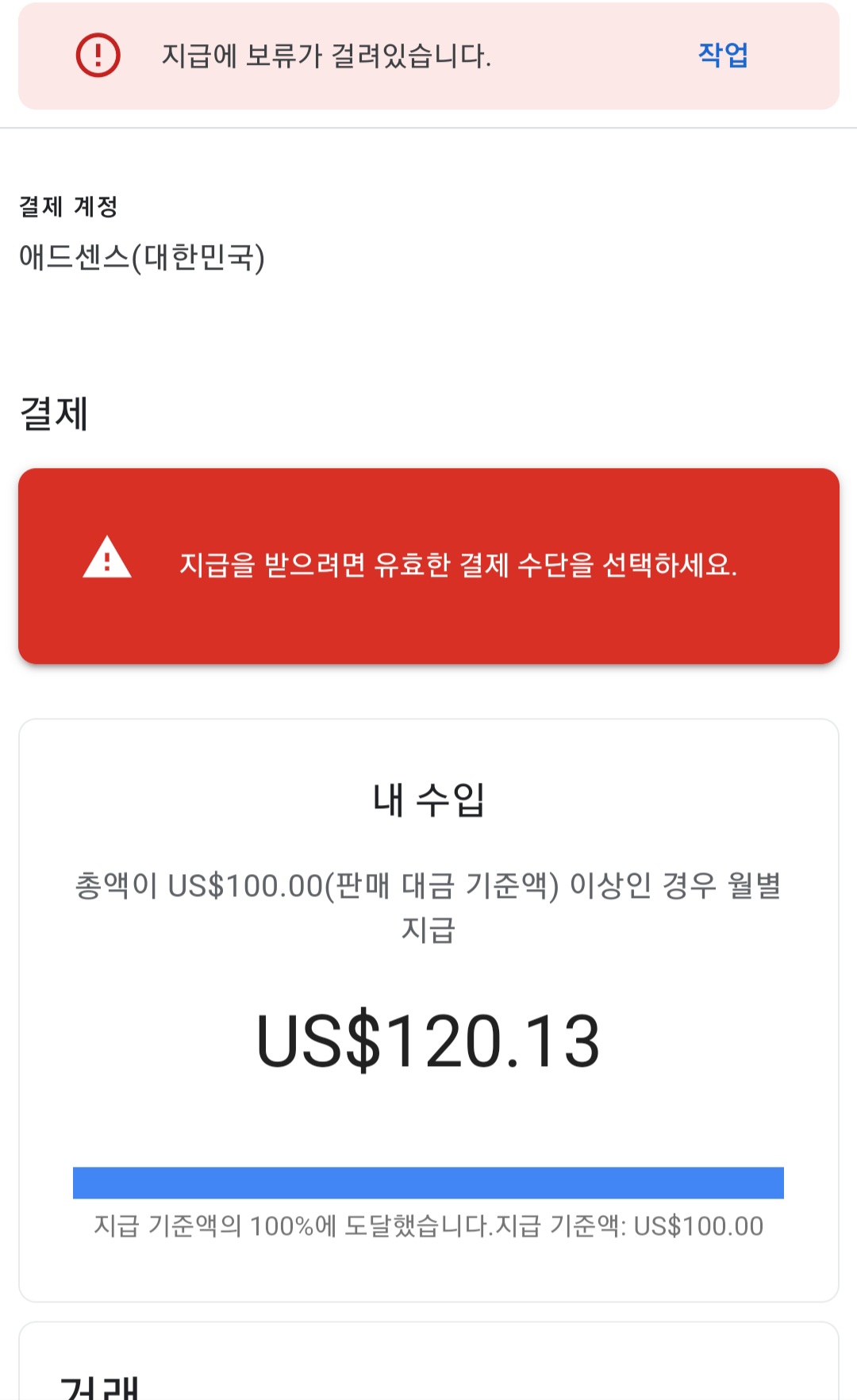 시작한지 딱 5개월만이에요~ 계좌 입력해놓는 걸 깜박했어요~ 그러면 아래 같은 빨간색 공지가 애드센스 계정에 뜹니다.