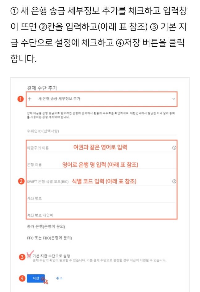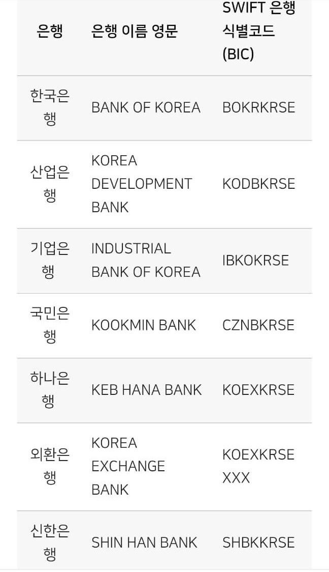 작업누르시고 본인 영문이름과 외환계좌 입력해주시면 됩니다. 저는 하나은행이 주거래 은행이라 하나은행에서 만들었는데 다른 분들도 많이 사용하는 계좌라고 하더라구요. 여러 주요 은행의 식별코드 첨부할게요.