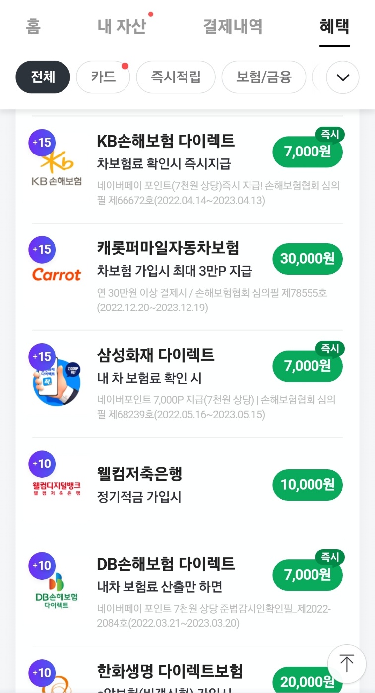 검색된 다이렉트 자동차 보험회사 고객센터에 전화하거나 인터넷 홈페이지에 접속하여 직접 견적을 요청할 수도 있지만 저는 네이버 페이-혜택 페이지를 통해서 자동차 보험료를 확인합니다.