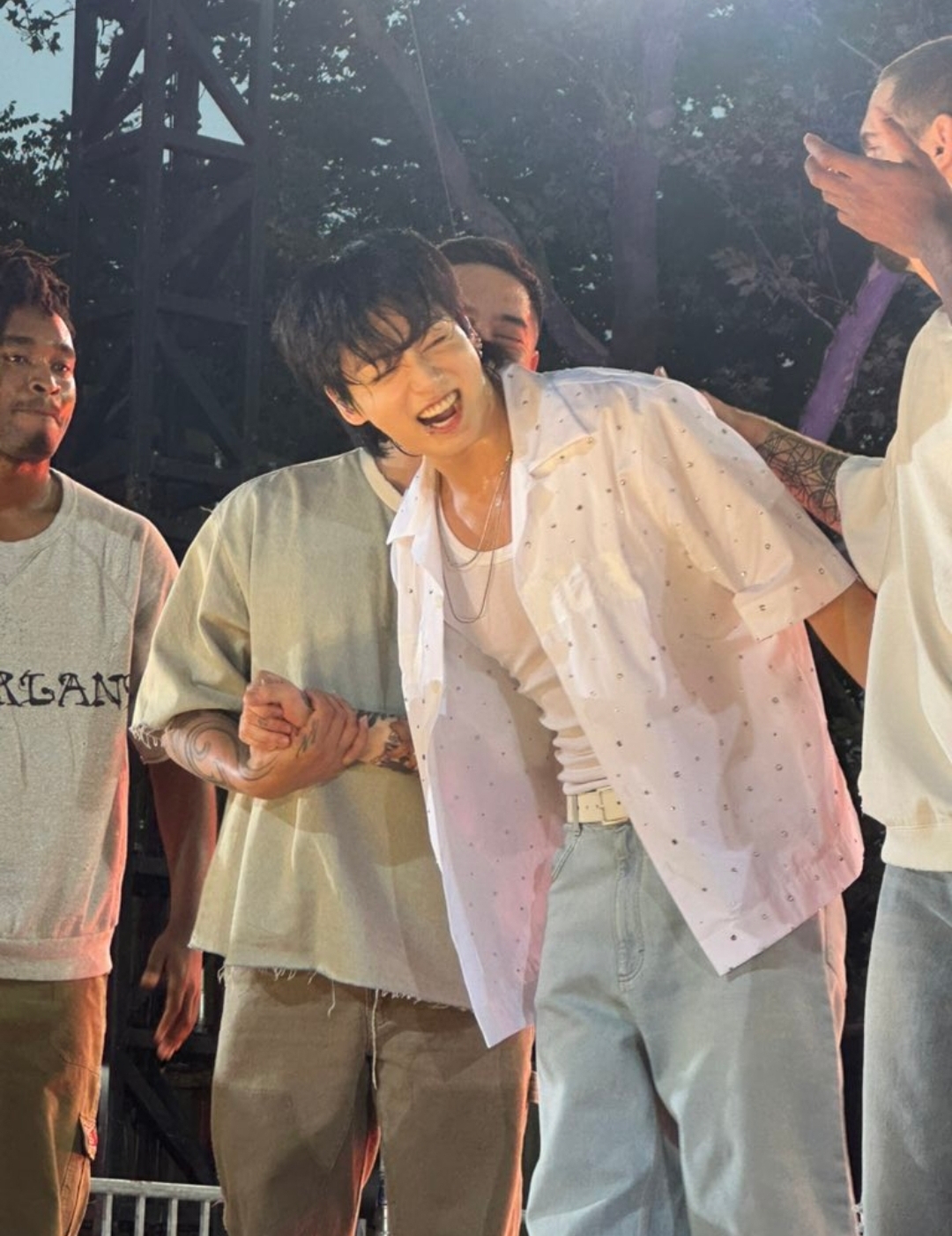 비 오는 중에도 열정적인 무대를 끝내고 댄서들과 웃는 정국의 모습은 마치 청춘영화 한 장면 같았다. 각본 없고 설정 없는 그 자체가 청춘영화 속 주인공인 눈부신 저 남자를 사랑하지 않을 수 없다.