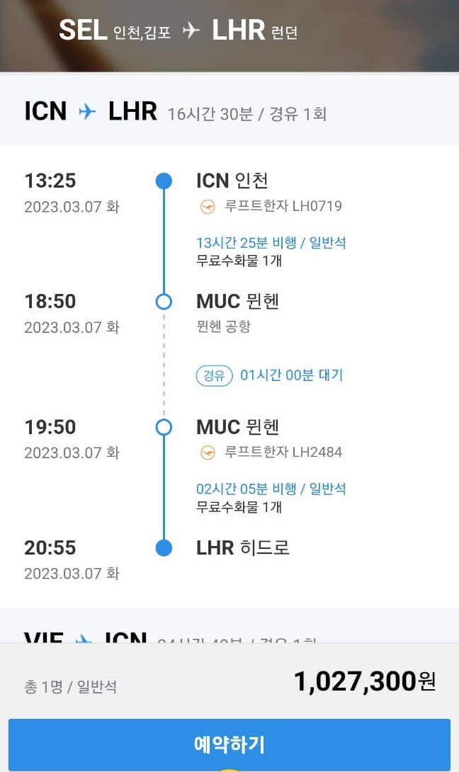 여러 검색된 할인 항공권 중에서 경유 항공권을 선택합니다. 경유 항공권은 다른 나라나 도시를 경유하기 때문에 상대적으로 직항보다 더 저렴합니다. 그런데 이것을 잘 이용하며 경유지에서 체류가 가능하기 때문에 공짜로 나라나 도시 하나를 더 여행 할 수 있습니다. 항공권의 상세일정을 눌러서 맘에 드는 경유지와 시간을 체크합니다. 저는 위에 있는 항공권 중에 루프트한자 항공의 일정이 좋아 보여서 상세일정을 체크해보겠습니다. 갈 때는 뮌헨을 경유하기 때문에 뮌헨 체류(스탑오버)가 가능합니다.