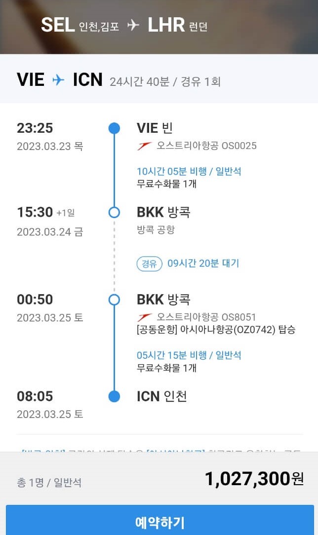예를 들자면 3월 7일 화요일 인천에서 출발하여 오후 6시 50분에 도착하고 뮌헨에서 3일을 보낸 3월 10일 오후 7시 50분에 런던 히드로로 출발하게 예약하면 추가금 없이 뮌헨에서 3일 여행을 할 수 있습니다. 돌아올 때는 3월 23일 오후 11시 25분 오스트리아 빈에서 출발하여 다음 날 오후 3시 30분에 방콕에 도착합니다. 여기서 다시 방콕에서 3일 여행을 하고 28일 12시 50분에 방콕에서 출발하는 항공 스케줄로 예약하시면 다시 추가금 없이 3일 방콕 여행을 할 수 있습니다. 두나라 모두 체류하지 않고 한 나라만 체류해도 가능합니다.